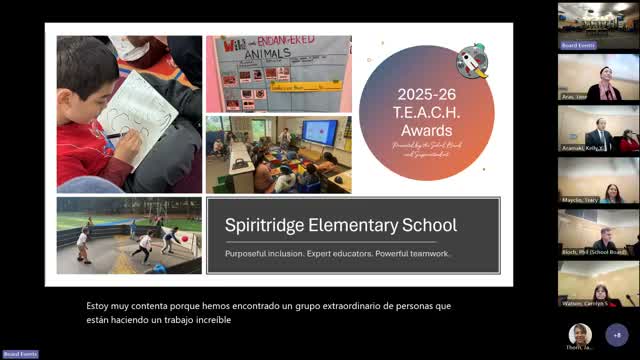 The board recognized Spirit Ridge Elementary staff for a coordinated inclusion model and special-education practices; Director Jane Aris read a statement highlighting hub-based services and professional development that support students with IEPs.