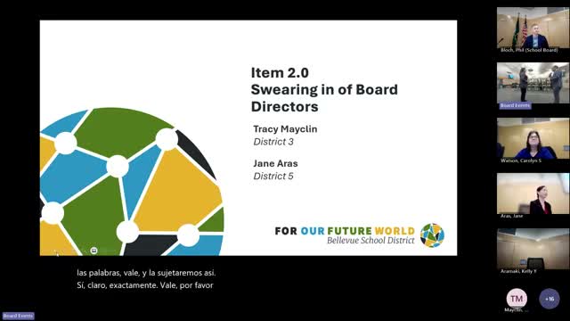 Kelly Aramaki administered the oath of office to Tracy Macklin, who affirmed support for the U.S. and Washington state constitutions and her duties as director of District 3 for Bellevue School District No. 405 in King County. Jane Aras was subsequently sworn in for District 5. Both newly sworn directors offered brief remarks: Macklin said she was "humbled, excited and ready to roll up my sleeves for the work ahead," and Aras said she is focused on doing the work of the board.