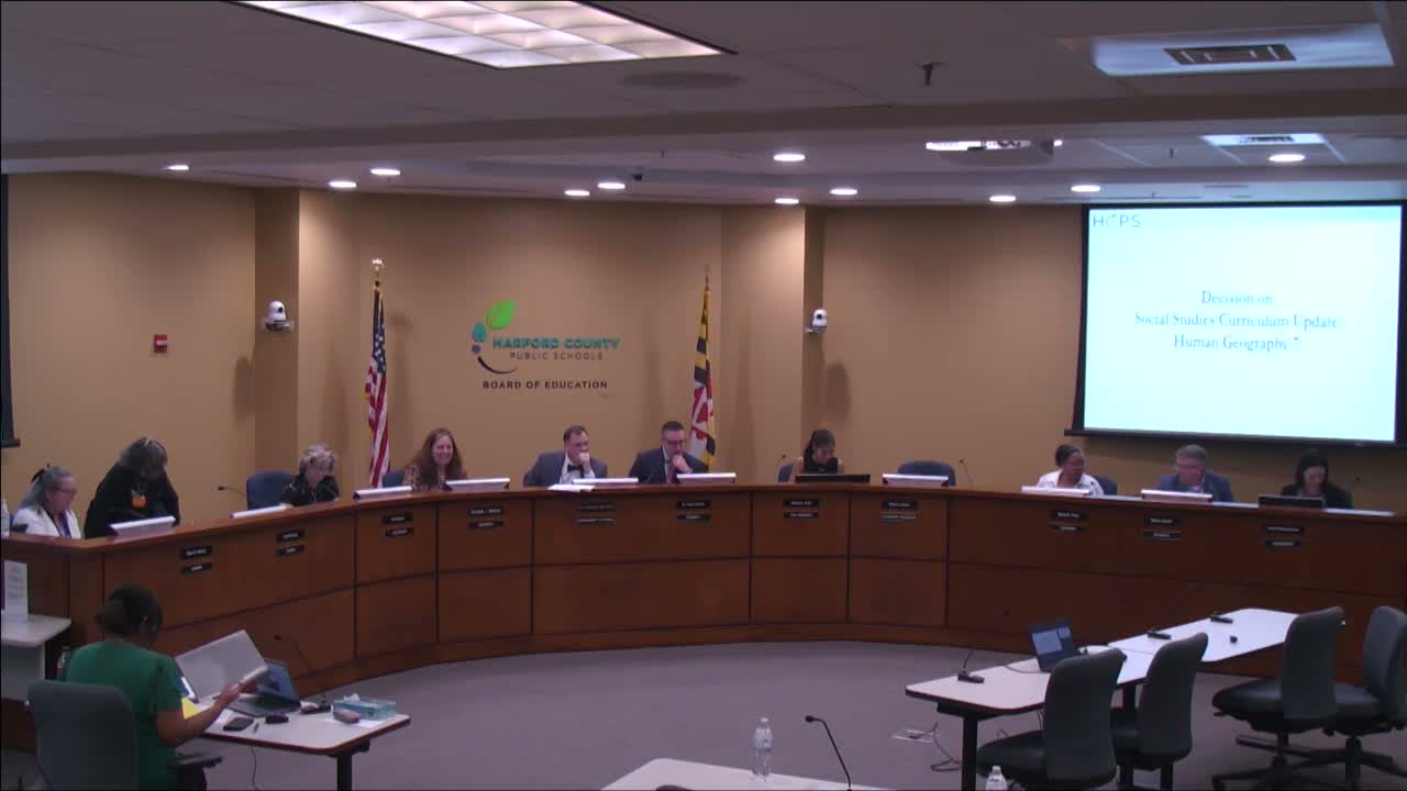 Harford County Public Schools presented a locally developed Grade 7 human geography curriculum on June 9 and the board voted to postpone final approval for two weeks so staff can incorporate requested edits.