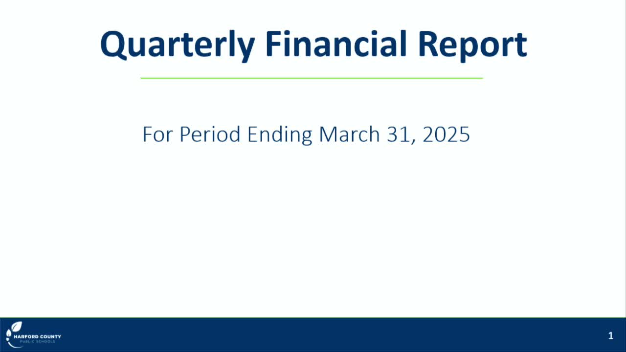 The Harford County Board of Education on May 19 received a quarterly financial report for the period ending March 31, 2025, and approved the consent agenda and two administrative appointments after roll‑call votes.