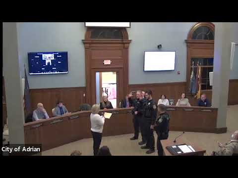 The Adrian City Commission swore in two new police officers during its Jan. 5 meeting and heard a series of public comments raising safety, procurement and property‑development concerns.
