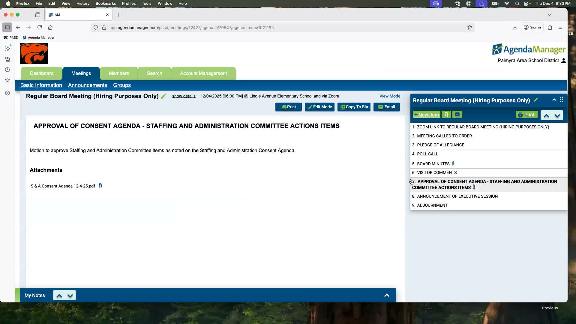 The Palmyra Board of School Directors approved the staffing and administration consent agenda at its Dec. 4 regular meeting, the chair announced.