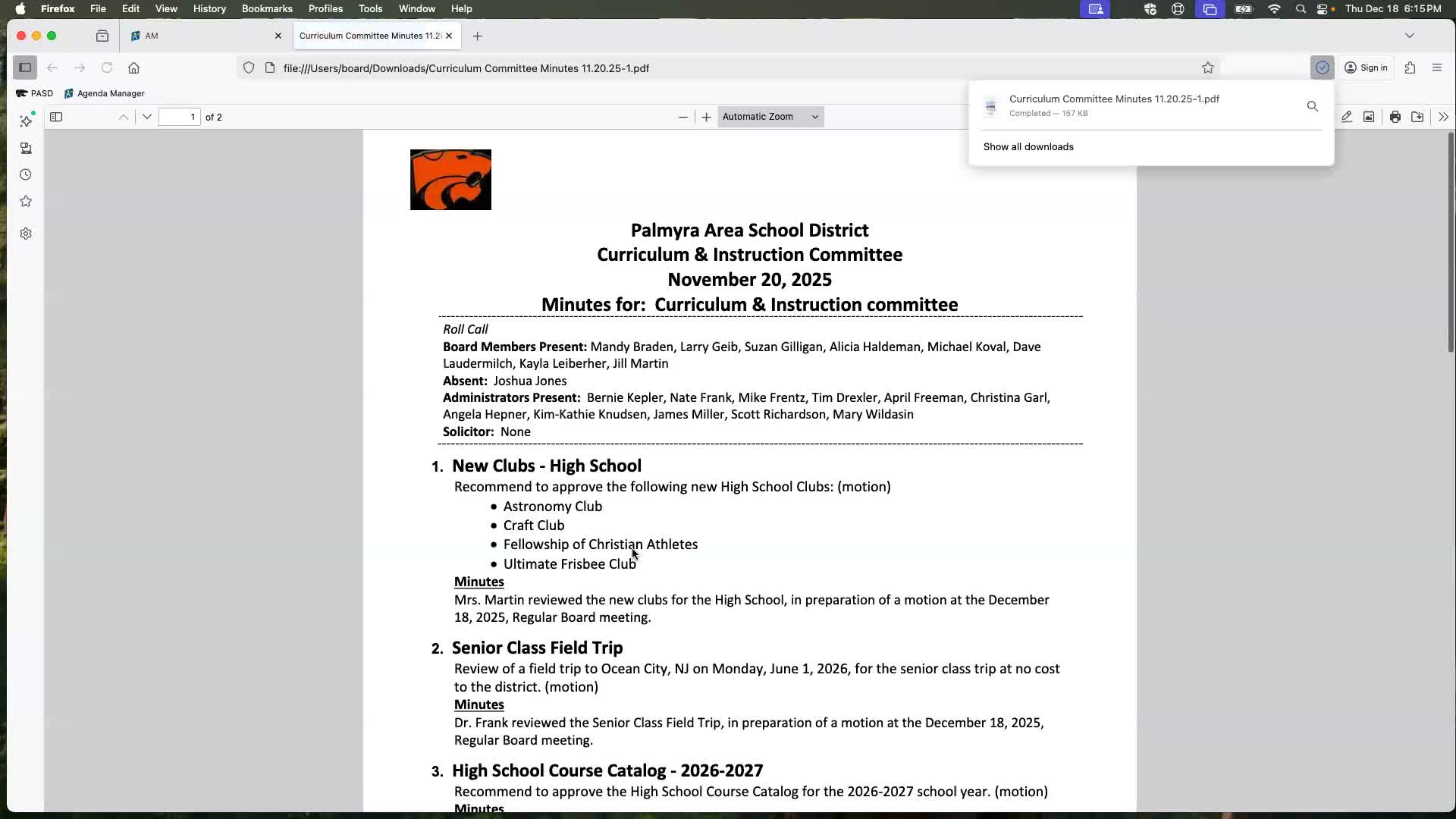 The Palmyra Area School District board approved consent-agenda items for curriculum and for staffing and administration during its Dec. 18 meeting.