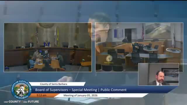 The Santa Barbara County Board of Supervisors read a closed-session item on a potential lawsuit involving Sable Offshore Corp and recessed for an estimated 45-minute closed session to consider initiating litigation against the company.