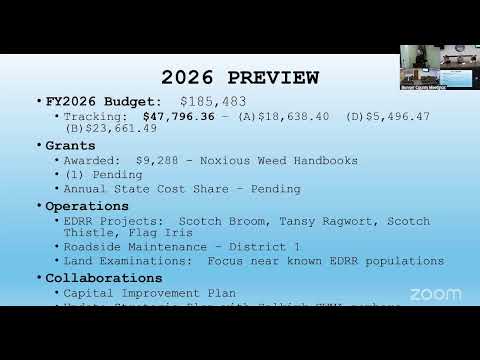 - Budget and grants: For fiscal 2025 the program was budgeted $158,182 and spent $146,287, leaving roughly an 8% cushion; cash on hand was reported just under $165,000. The department received a $7,582 state noxious-weed cost-share award and was awarded $9,288 to revise and reprint the Noxious Weed Handbook. The Director said one additional education/outreach grant is pending and that state cost-share awards should be announced in April after a February review.