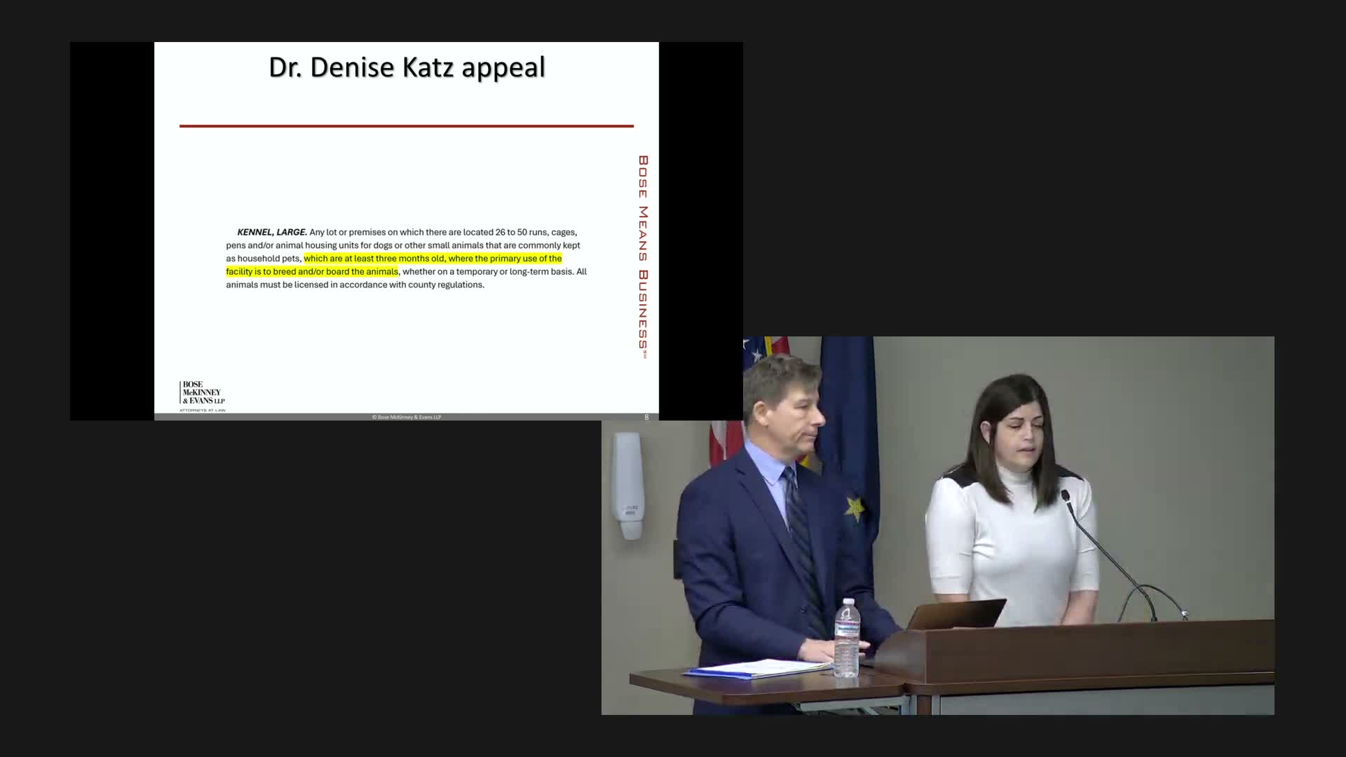 Dr. Denise Katz, introduced by attorney Steve Grove, disputed the finding. Katz said she owns the animals, operates the Love Pet Project (registered as a 501(c)(3)), maintains USDA and state records and microchips animals to herself, and that the site’s animals are not being bred or boarded for financial gain. Katz told the board she had 50 animals on the property that day, including 38 dogs, and that roughly 70 percent of dogs are three months old or younger because the rescue focuses on medical cases and puppies.