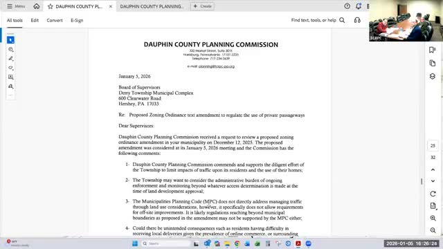Planning staff told the Dauphin County Planning Commission that a proposed Derry Township amendment limiting commercial/industrial vehicle access is 'unique' and may exceed municipal powers; the commission voted to send staff comments and asked to be included in the township solicitor’s review.
