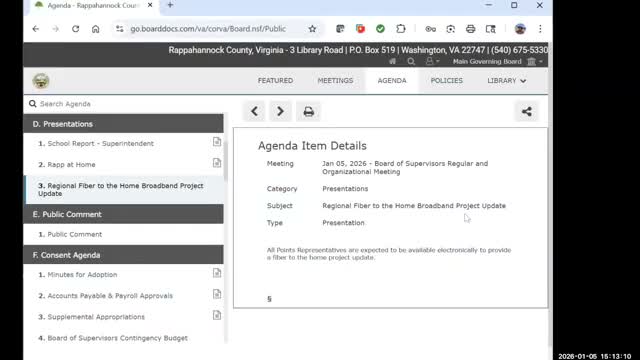 AllPoints Broadband told the Rappahannock board construction is underway, the first county cabinet should be active in mid‑February, about 4.5% of the first 263 addresses have begun sign‑up steps, and AllPoints outlined permitting, private‑road easement and installation rules.