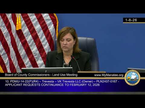 Rachel Layton, speaking on behalf of the Manatee County Board of County Commissioners, opened a meeting that proceeded without a full board and read a long list of land‑use and ordinance items the board will not decide at this session.