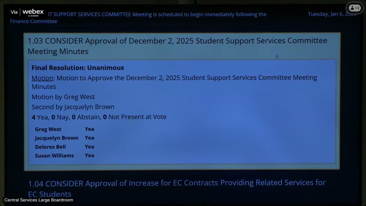 At the Student Support Services committee, staff requested and the committee approved increases to special-education (EC) contracted services to cover evaluations and direct supports that the district currently outsources because of workforce shortages. Staff described adding part‑time and contract PT, SLP and VI services to address vacancies and a larger demand for assessments.