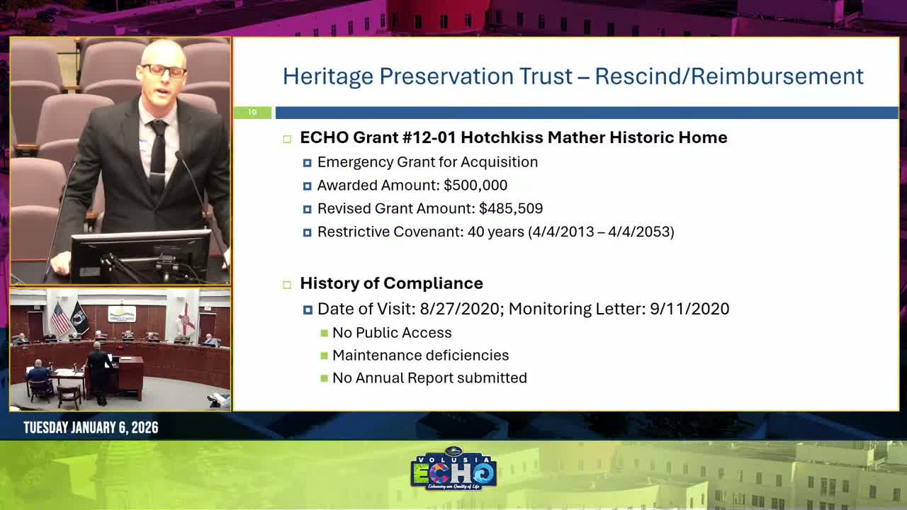 ECHO staff told the Volusia County ECHO Advisory Committee on Jan. 6 that two historic properties awarded in 2009 and 2012 are out of compliance and that county legal is preparing enforcement steps that could include recording liens and pursuing repayment.