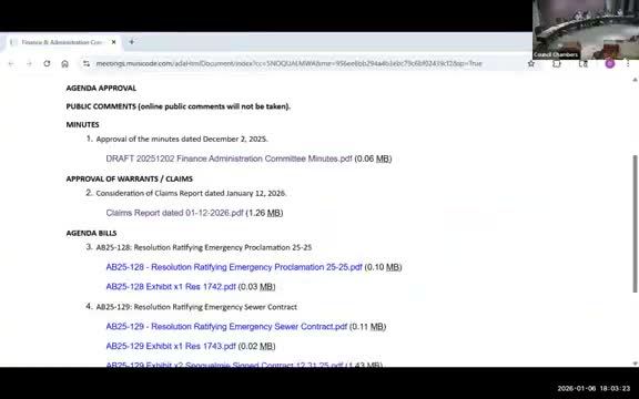 The Finance & Administration Committee discussed a resolution to ratify the mayor's December emergency proclamation, heard staff estimates of roughly $320,000 (direct) to $520,000 (including repairs) in city costs from the storm, and outlined steps and deadlines for state and federal reimbursement.