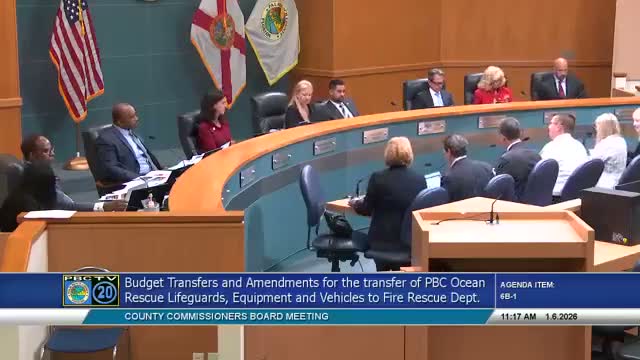 The Board of County Commissioners voted unanimously to transfer Ocean Rescue operations from Parks & Recreation to Palm Beach County Fire Rescue and approved an $8.1 million funding package plus $127,000 in capital transfers to support the transition and equipment needs.