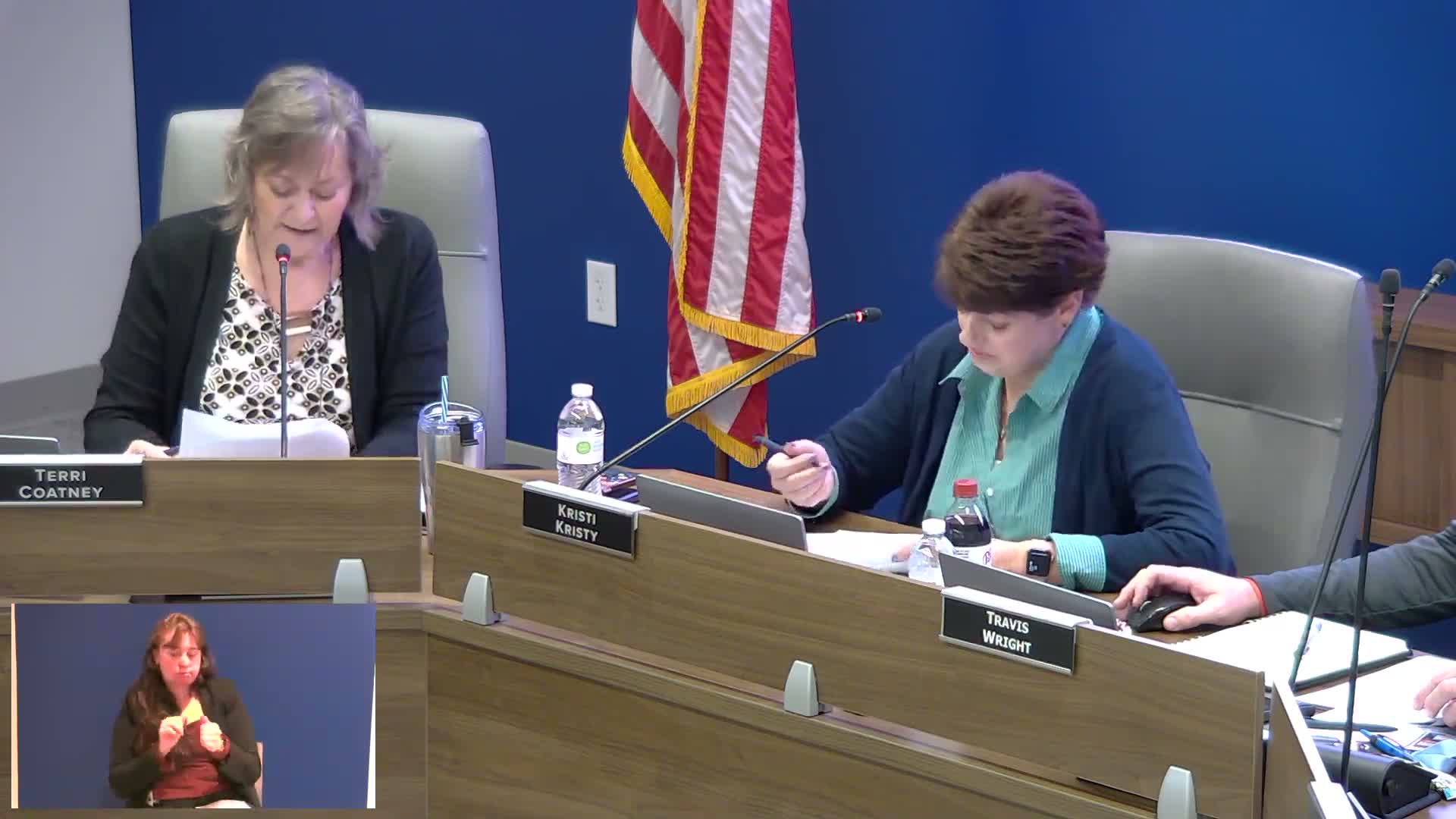 Board members voted, by voice, to approve second readings of policies including C180 (advertising and solicitation), C181 (political solicitation), D190 (payroll), G467 (paid parental leave), G500 (compensation guides and contracts for support personnel) and G570 (schedules of classified personnel). The board also approved several first readings around early graduation (I371), graduating with honors/distinction (I373), test security (I383), controversial issues (I420) and a wellness policy (I440). Motions were regularly moved by Mr. Triplett and seconded by Ms. Henderson; each motion was recorded as carrying.