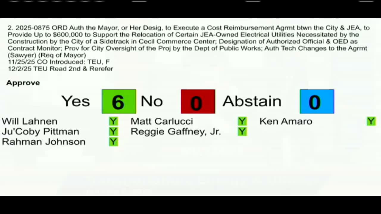 The Transportation, Energy and Utilities Committee voted unanimously Tuesday to approve seven agenda items, including a series of JEA agreements amended to correct employee pay‑range language and an emergency measure to allow construction to proceed under an expiring grant.