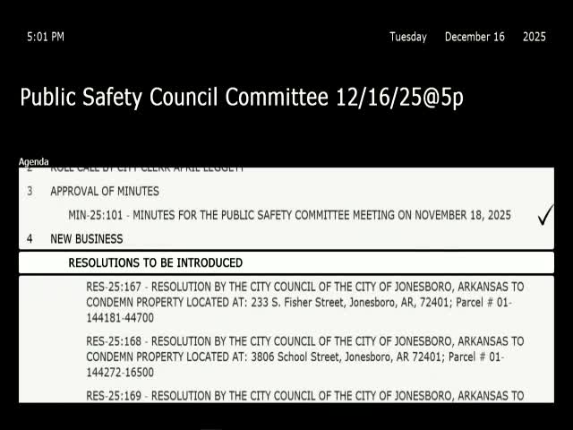 The Jonesboro Public Safety Committee voted to forward three property-condemnation resolutions and an application for FY2026 bulletproof vest grant to the full City Council; staff said the condemnations respond to safety hazards documented by inspectors and the fire marshal.