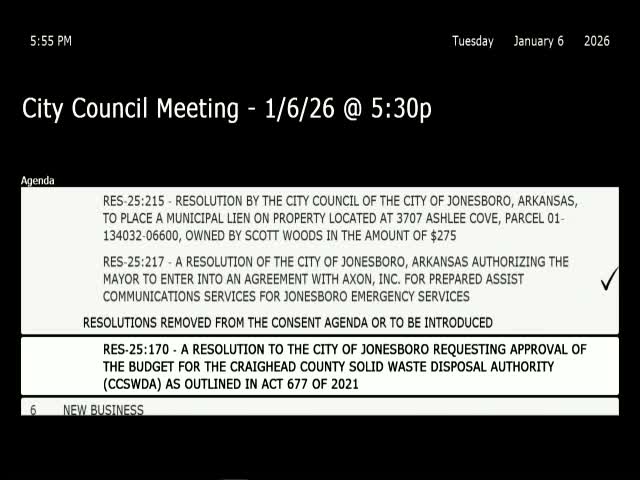 Budget acceptance: By resolution the council accepted the Craighead County Solid Waste Disposal Authority's proposed 2026 budget, a requirement under Act 677 of 2021 that authorities submit annual budgets to member governing bodies for review. The resolution was read into the record and the mayor announced the motion carried.