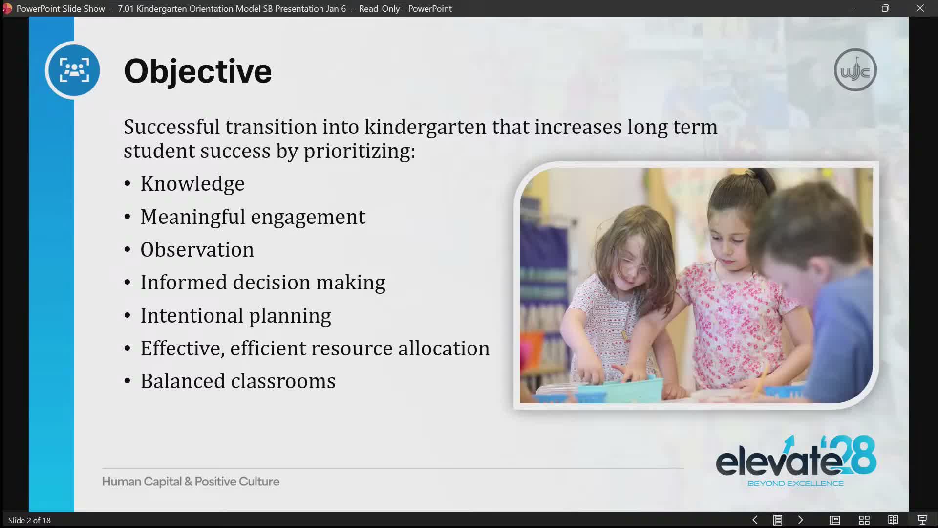 Williamsburg-James City County Schools presented an update on a new kindergarten orientation model piloted this school year at D.J. Montague, Laurel Lane and Norwich elementary schools. Division staff described an eight-day model organized into two phases: student experience days (core instruction, small-group observation and relationship-building) followed by two non-attendance days for staff to make informed placement and planning decisions.