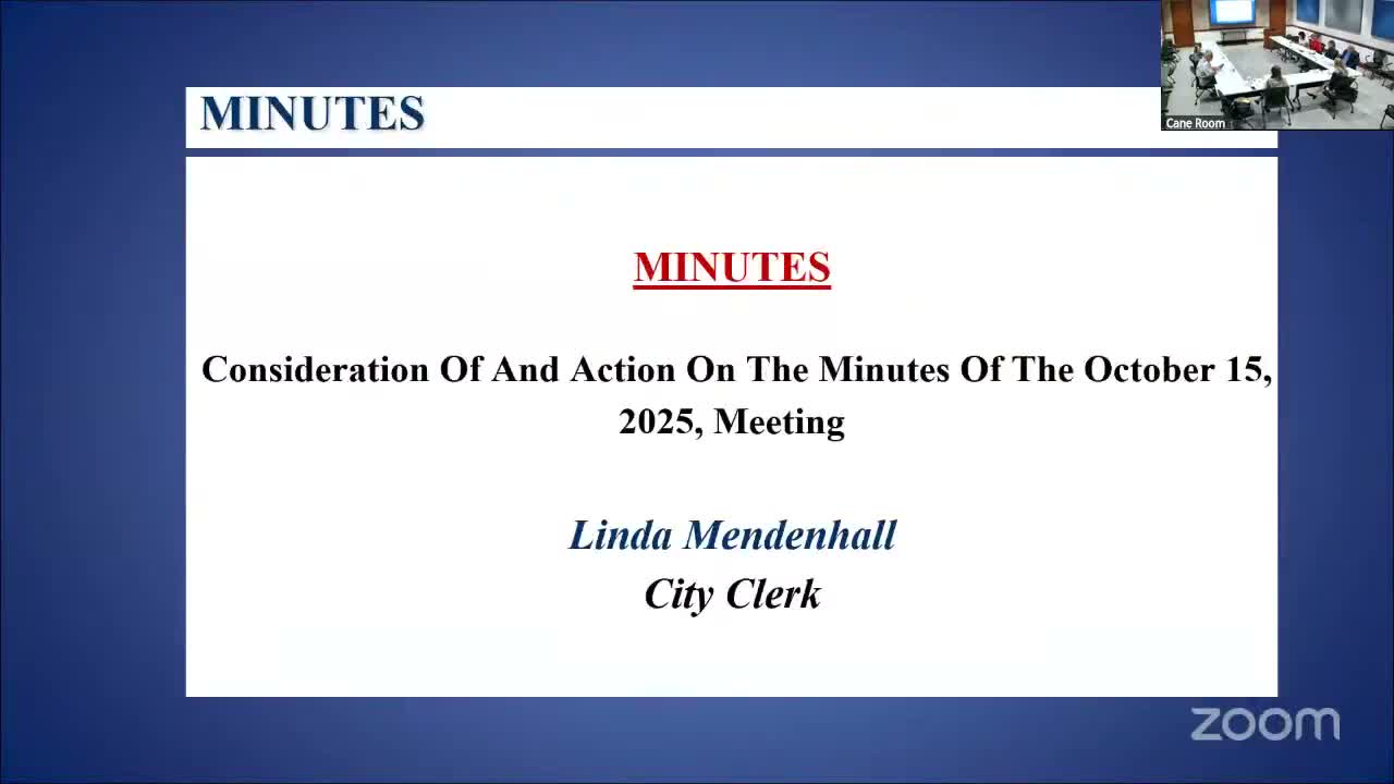 Procedural actions at the meeting included approval of minutes from the Oct. 15 meeting and adjournment at the close of the agenda. The board did not record roll-call tallies for votes in the portion of the transcript provided.
