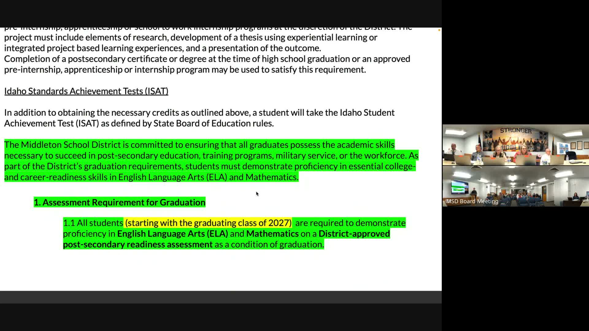 Johnny (district staff) framed the proposal as an additional step to support students, not a punitive measure, noting the district’s high graduation rate (about 96%) but lower ISAT proficiency rates (roughly 70% English, about 50% math). Under the draft, juniors who test below proficiency would be required to take one or two semester remediation courses during their senior year (English, math or both, as needed). The district would grade those courses pass/fail; passing the course would satisfy the requirement and the district would not, as written in the draft, require students to retake the ISAT to graduate.