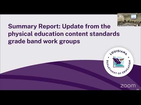 The Physical Education Standards Review Committee voted to endorse revised K–12 standards under Domain 2 and heard grade-band work-group updates adding water-safety and concussion-literacy measures.