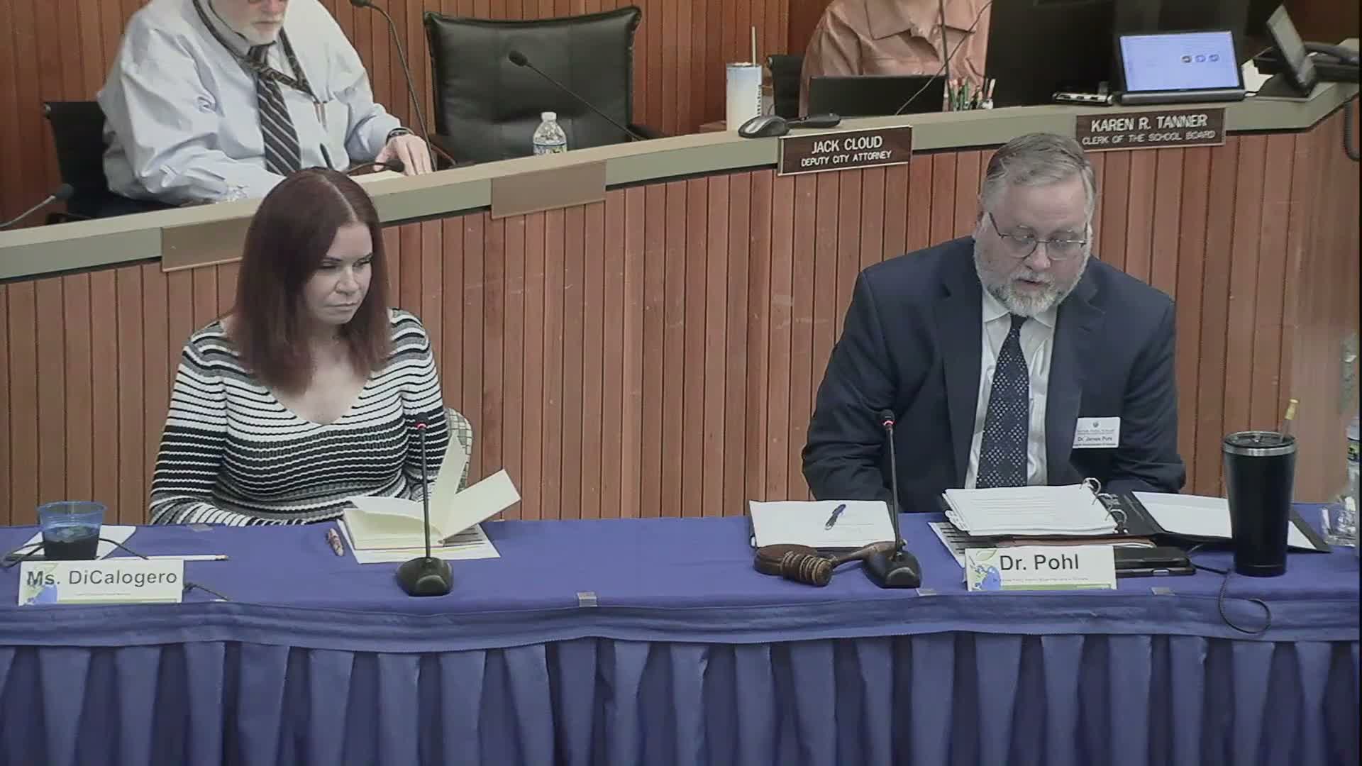 Separately, the board approved a motion to keep Dr. Michael Catato as the superintendent's designee until his retirement and then to designate Dr. Sherry Agnew Scott (chief human resources officer) and Mr. Richard Veil (chief operations officer) as designees following that retirement; the motion passed by a 7-0 roll-call vote. Later in the meeting the board voted to move into a closed executive session under subsection(s) of the Virginia Freedom of Information Act to discuss personnel matters, possible superintendent contract details, contract award terms and to consult legal counsel on specific legal matters. The motion passed on a roll-call and the board entered closed session.