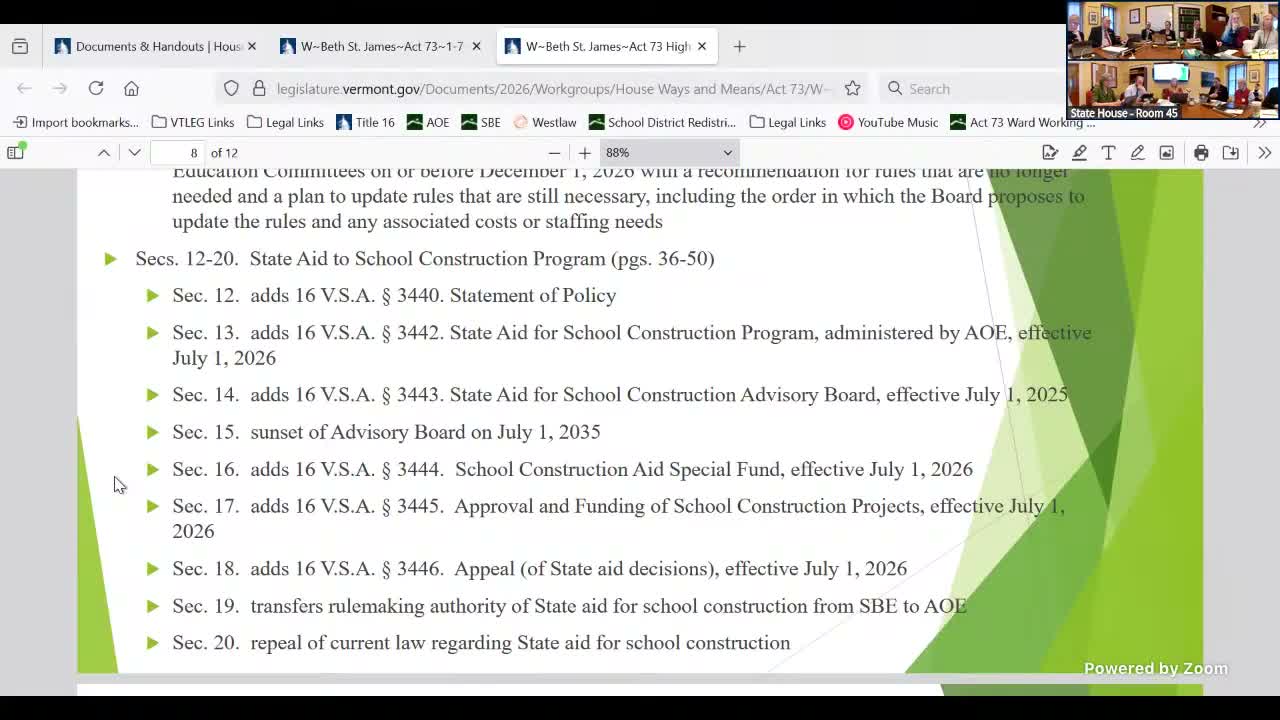 St. James summarized Act 73’s school-construction provisions and related funding for Agency of Education support.