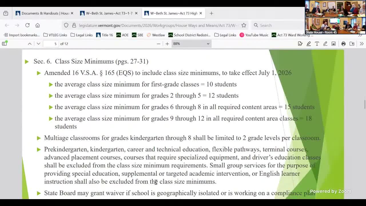 Committee briefing clarified that class-size minimums in Act 73 take effect 07/01/2026, include multiple exemptions, allow State Board waivers for geographic isolation, and set a multi-year enforcement timeline that could delay state-board intervention until 2031.