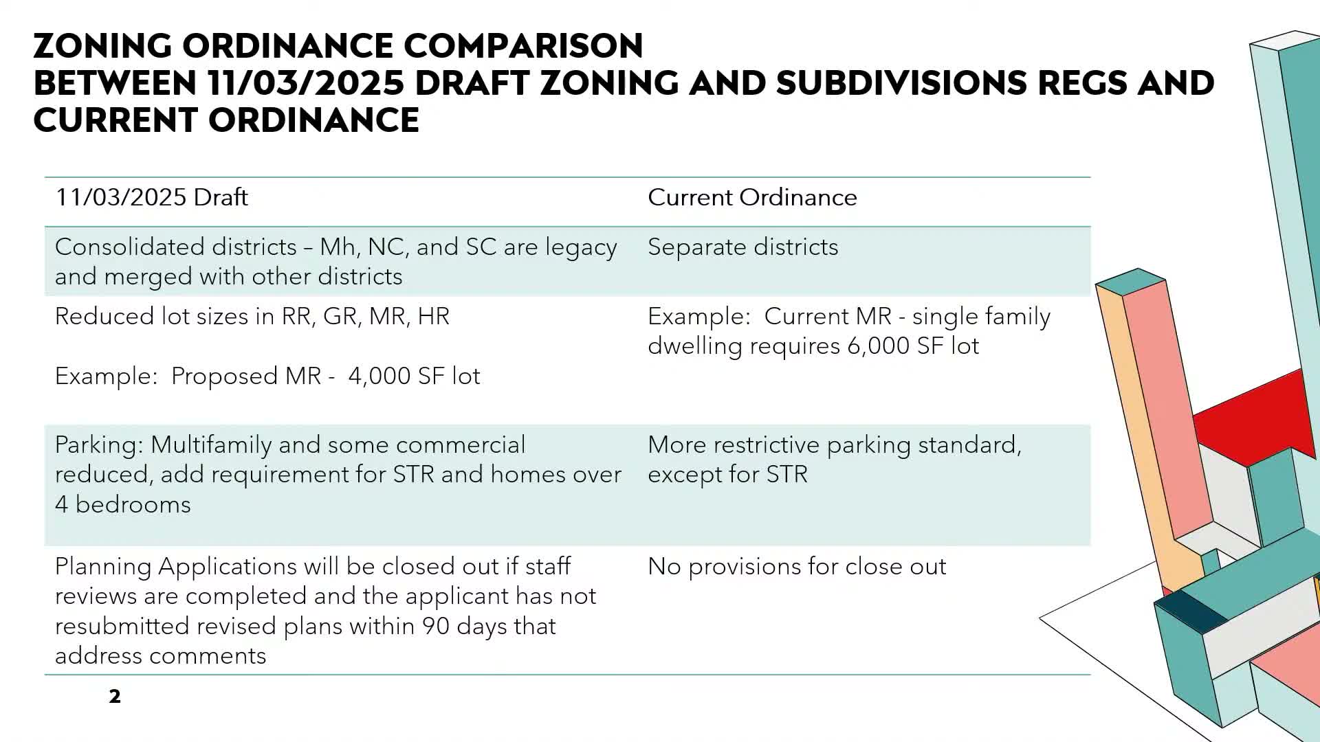Glynn County planning staff on Monday presented a draft rewrite of the county zoning ordinance that proposes several changes intended to expand housing options and streamline development review while also tightening some coastal protections. The draft would reduce the minimum lot size in certain higher-density residential districts from 6,000 square feet to 4,000 square feet and would allow detached accessory dwelling units (ADUs) under size limits.