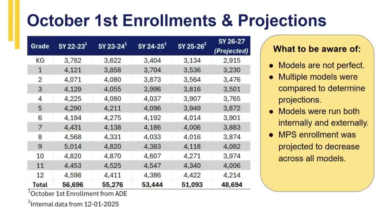 In a study-session presentation, district demographer Glassmeyer said multiple projection models — including a long-range forecast from Applied Economics — put next year’s enrollment about 2,400 students below current levels. Glassmeyer described that as an estimate and emphasized variables such as housing construction, birth rates and cross‑district movement that can change the outlook.