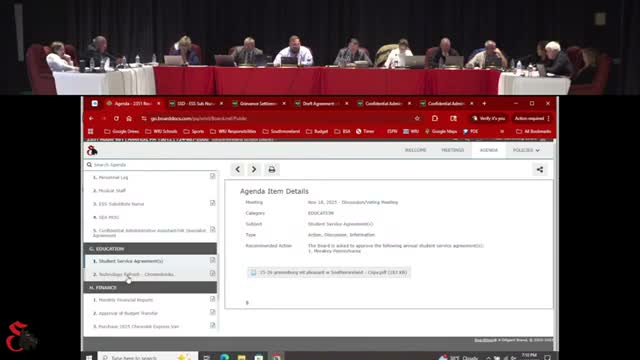 The Southmoreland board approved a $160,594.92 purchase of roughly 459 Chromebooks as part of a technology refresh. Board members questioned budgeting and device counts; Business Manager Pam Mondock said the district had budgeted $109,000 and would use multiple line items to cover the purchase.