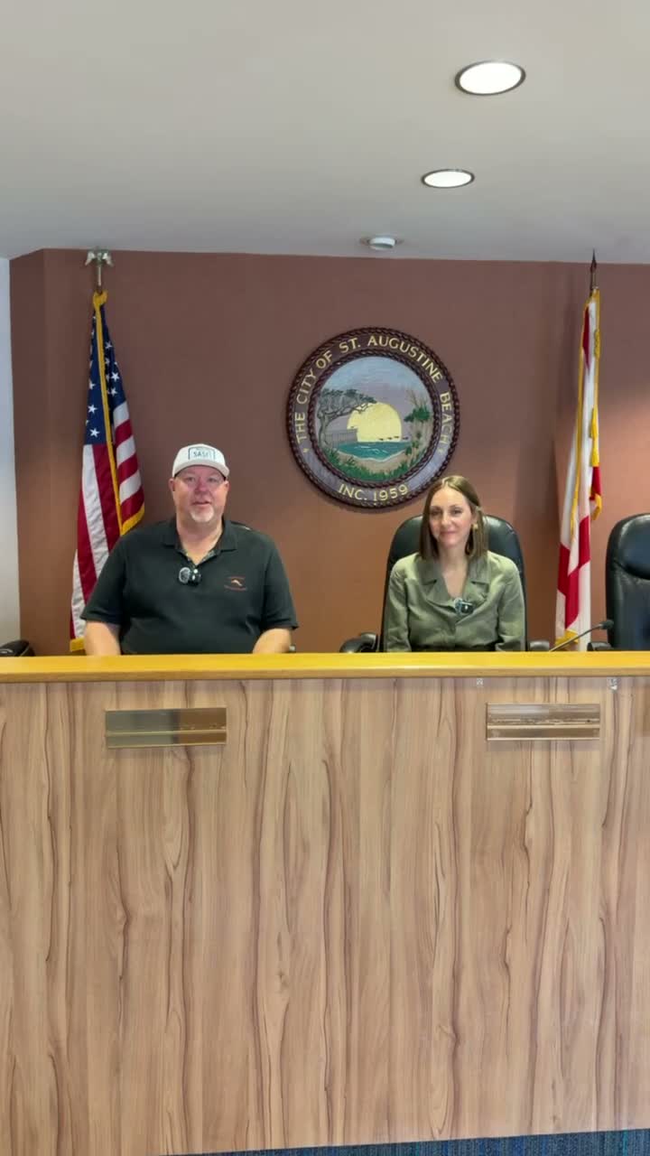 Commissioner Dylan Rumrill ceremonially passed the gavel to Mayor Beth Sweeney on Monday morning for the City of St. Augustine Beach 'Mondays with the Mayor' series; Sweeney invited residents and businesses to suggest topics and said the program will continue weekly.
