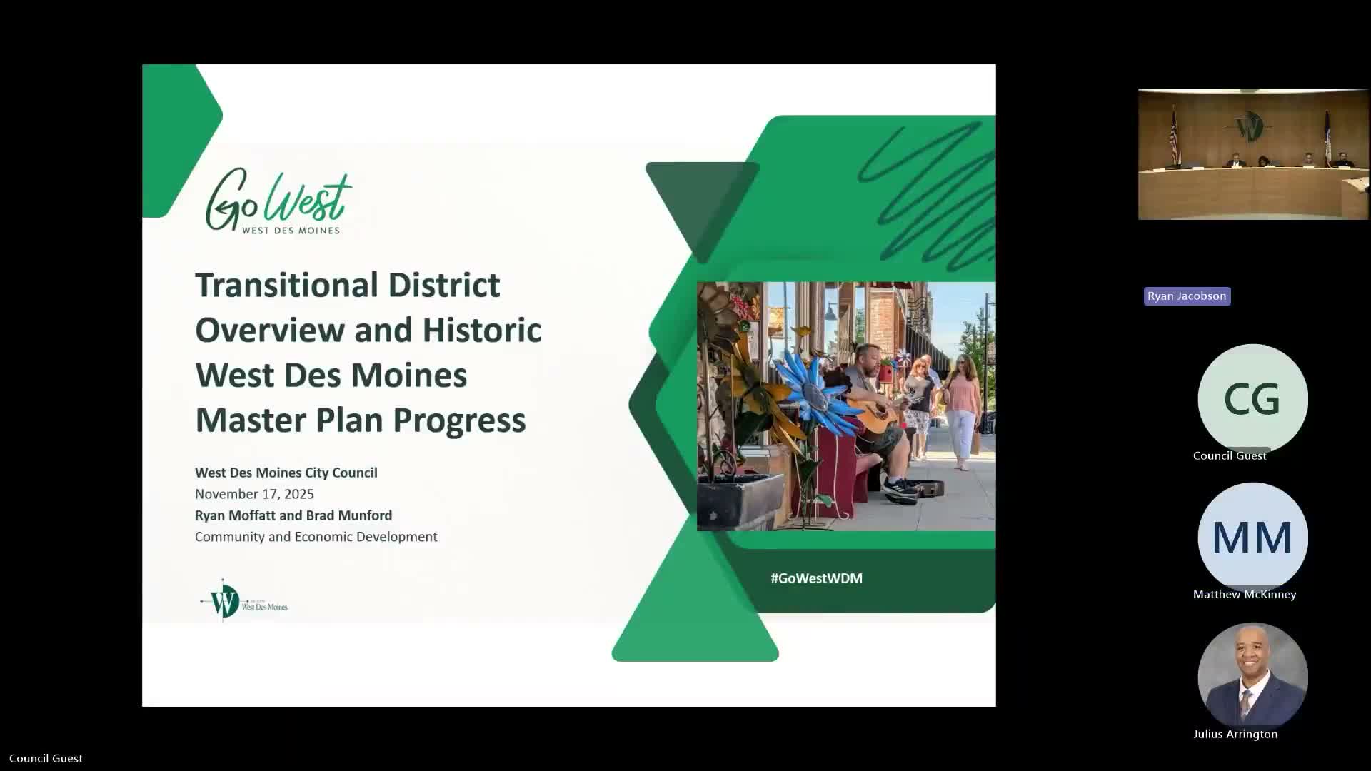 Ryan Moffitt, the city’s community and economic development director, summarized the Valley Junction effort as three linked documents—the master plan (about 90% complete), design guidelines (adopted December 2022), and a PUD/master-plan ordinance (about 60% complete)—and framed the night’s questions as whether the council wants to preserve primarily single‑family character or permit targeted reinvestment through transitional zones. He said the transitional zones are intended as a “relief valve” for 5th Street retail demand and a way to encourage "missing‑middle" housing such as small multifamily, townhomes or cottage clusters.