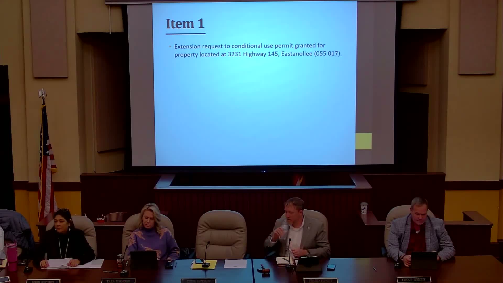County staff brought a conditional-use permit extension request for property at 3231 Highway 145 East in Ollie (parcel 055017). The original conditional use allowed removal of excess vehicles by 01/22/2026. Staff reported Chief Marshall Vincent Devasto’s on-site inspection found approximately 75 percent of vehicles removed and about 11 cars still on the property.