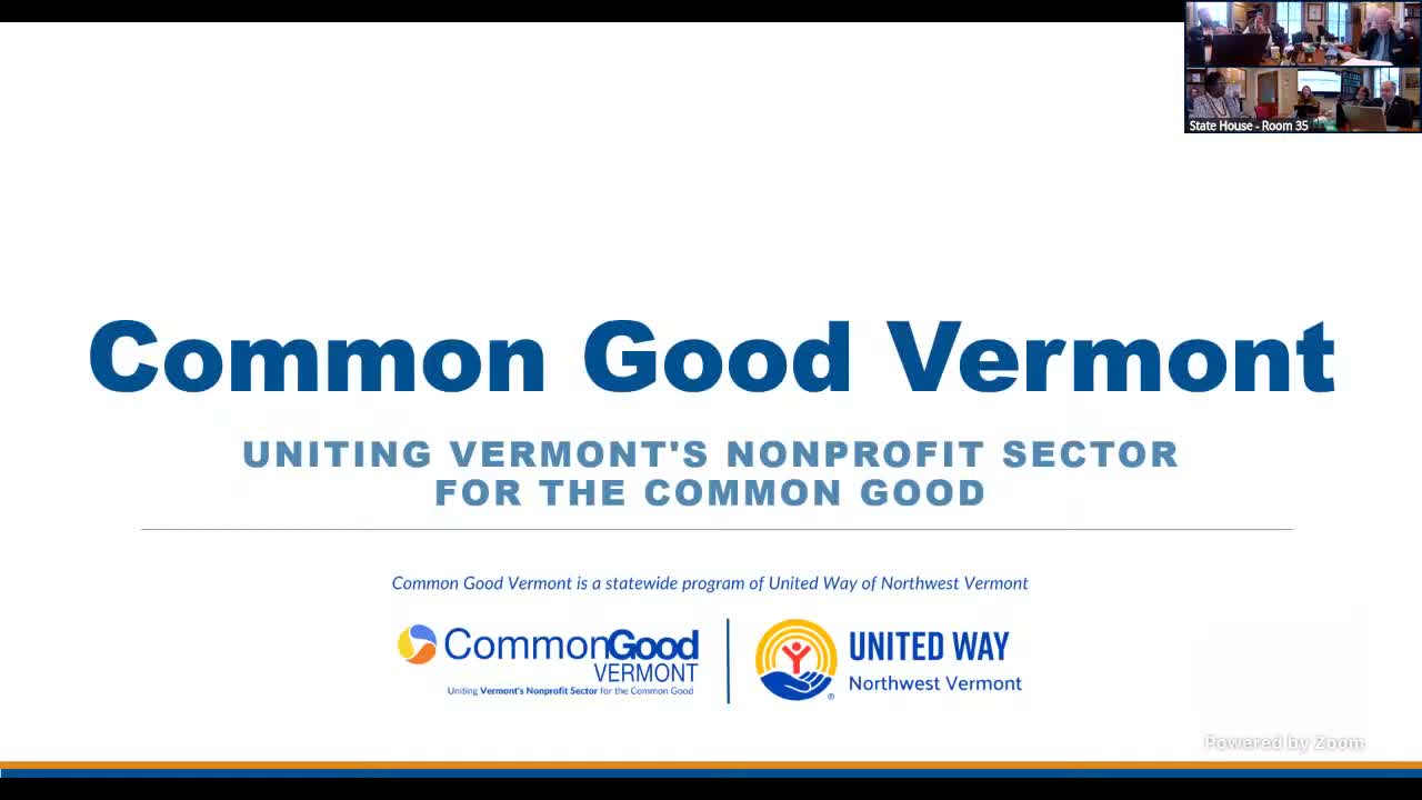 Common Good Vermont requested $295,665 one-time and $267,777 ongoing to provide triage, legal and shared-services support to nonprofits statewide. United Way and other partners backed the proposal; legislators asked about selection criteria and vetting of politically active organizations.