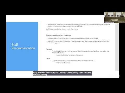 Emma, a city staff presenter, said the applicant "is proposing to construct an 8 foot fence along the 20 foot portion of the south property line" consisting of a 4-foot cedar fence atop an existing 4-foot concrete retaining wall to provide privacy and safety adjacent to an HOA common area. Emma told the hearing the fencing code "does allow 8 feet in any zone as a conditional use" and that consent from neighbors is not required for an 8-foot request.