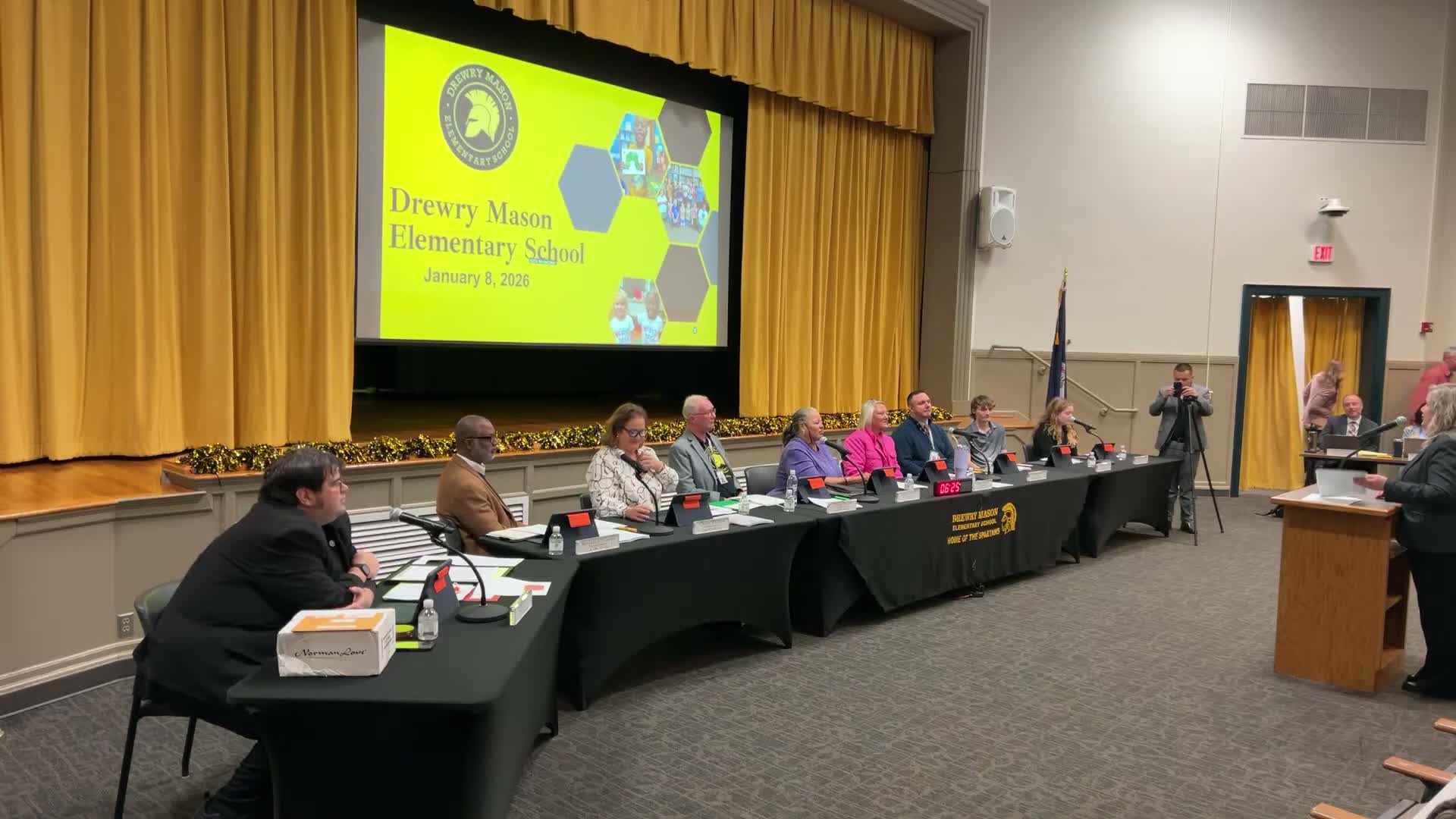 Drew Mason Elementary reported stronger-than-state SOL pass rates in reading (77%), math (78%) and science (72%), described attendance incentives (monthly parades, rewards) and introduced an Accelerated Reader program led by media specialist Ashley Cox, including book bundles and staff-read videos for families.