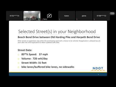 Amy Birch, a transportation engineer and consultant working with the Nashville Department of Transportation (NDOT), presented a preliminary traffic‑calming plan for Beach Bend Drive at an online neighborhood meeting. Birch said the 80th‑percentile speed measured on the street was 37 miles per hour and that two‑way daily volume was about 730 vehicles, and she outlined vertical measures such as speed tables and cushions as well as nonintrusive alternatives like radar feedback signs.