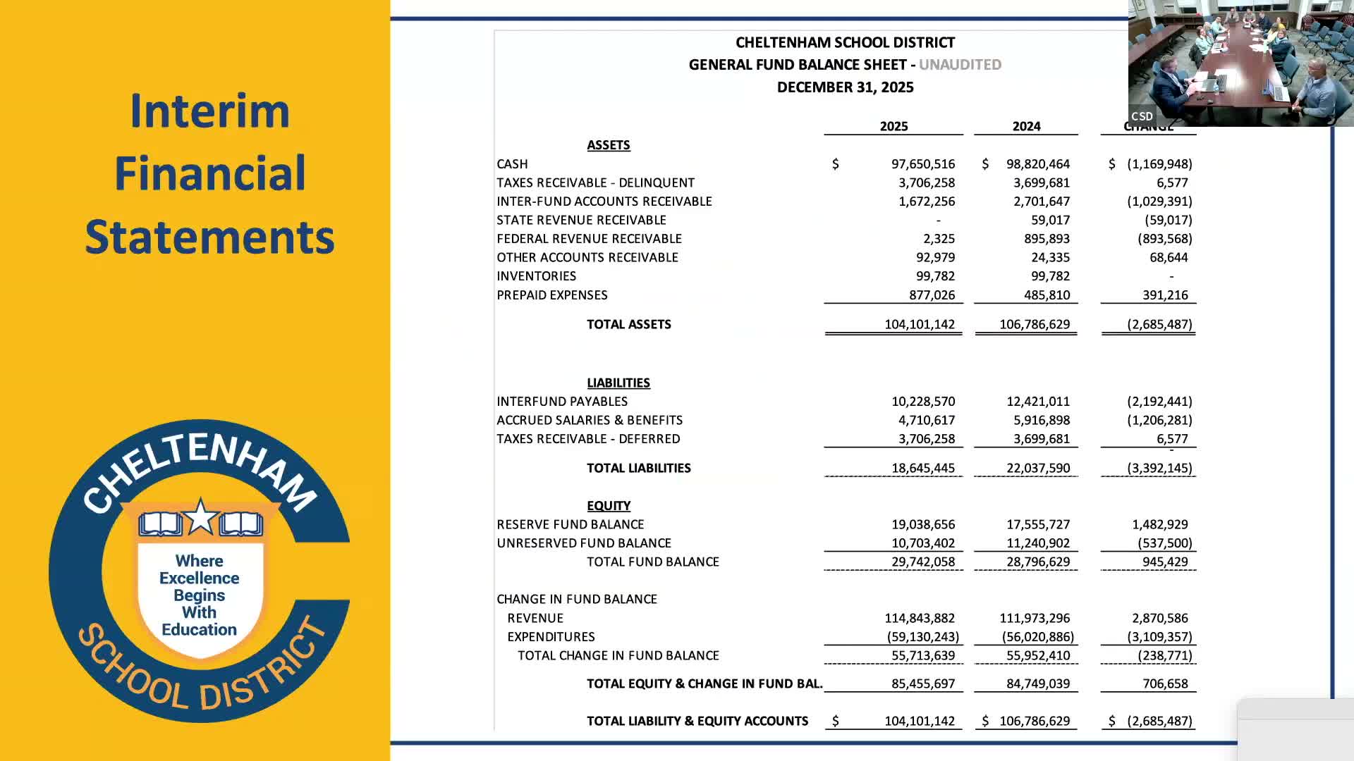 The Cheltenham School District finance committee reviewed interim statements through Dec. 31, 2025, was told the district retains a roughly $30 million reserve, learned state budget timing shifts Ready to Learn/tax-equity recognition into next year, heard a clean independent audit opinion, and placed three items on the upcoming legislative agenda.
