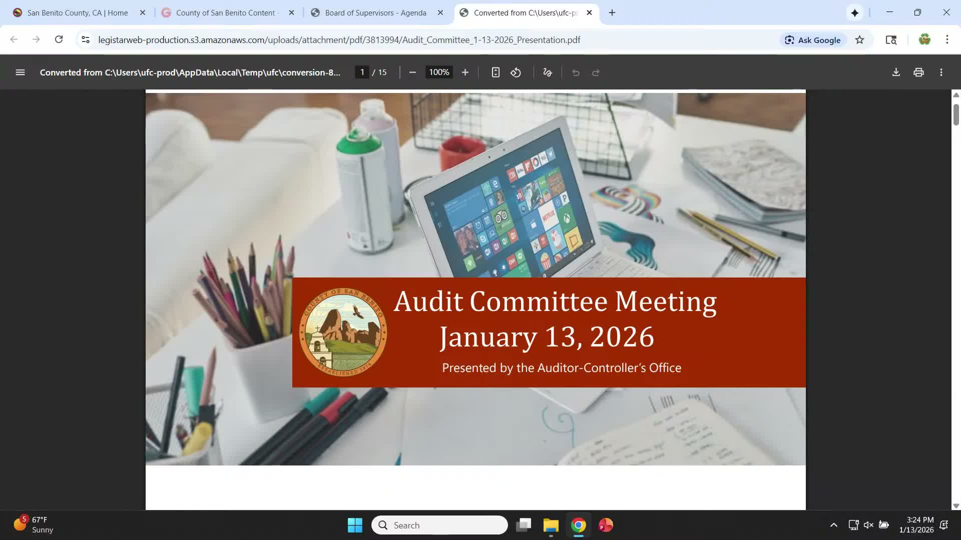 County Auditor Joe Paul Gonzales told the audit committee on Jan. 13 that the county’s annual comprehensive financial report (ACFR) for fiscal year 2024–25 remains incomplete because several departments submitted material transactions after the Sept. 5 year‑end close and the Schedule of Federal Awards (CIFA) from the Resource Management Agency (RMA) has not yet been provided to the auditor’s office.