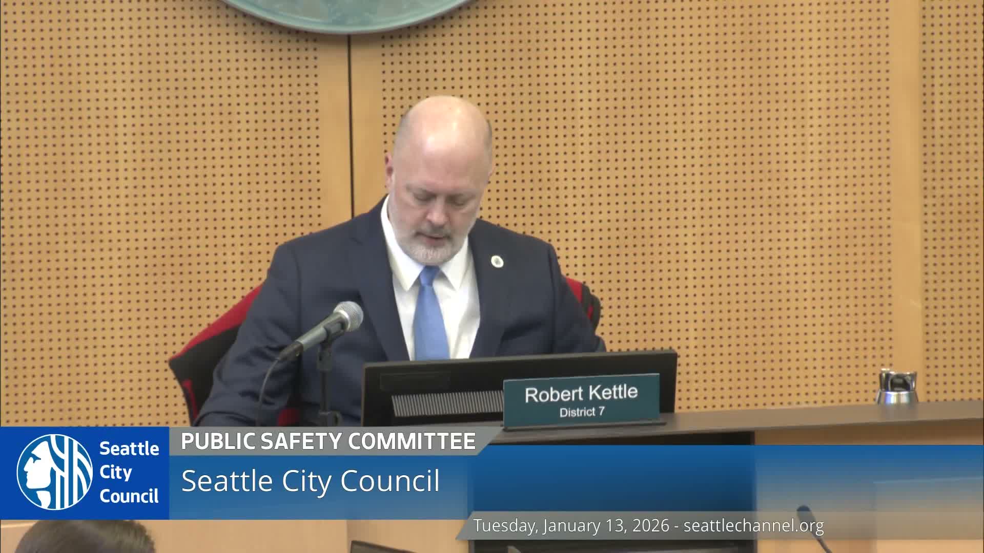 Chair Robert Kettle opened the Public Safety Committee on Jan. 13 by criticizing recent federal law enforcement tactics and calling for an "operational stand down of ICE in Seattle" until federal operations undergo a policy and tactics review.