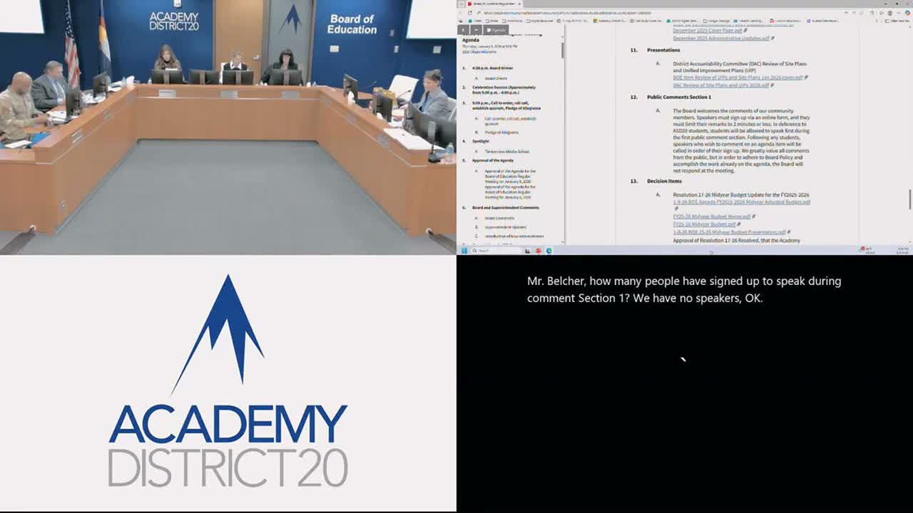 The Academy School District No. 20 Board of Education approved a midyear budget update (Resolution 17-26) after a lengthy presentation by Deputy Superintendent Becky Allen explaining revenue shifts, enrollment trends and proposed allocations.