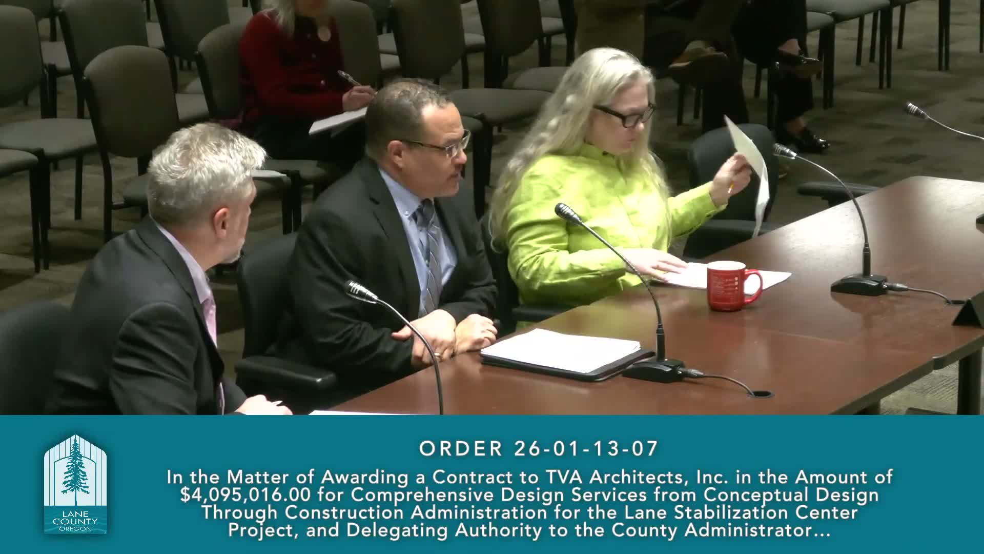 The Lane County Board of Commissioners voted unanimously Jan. 13 to award TVA Architects Inc. a contract to provide comprehensive design and construction-administration services for the Lane Stabilization Center, a facility intended to divert people experiencing mental-health or substance-use crises from jail and emergency departments into short-term treatment.