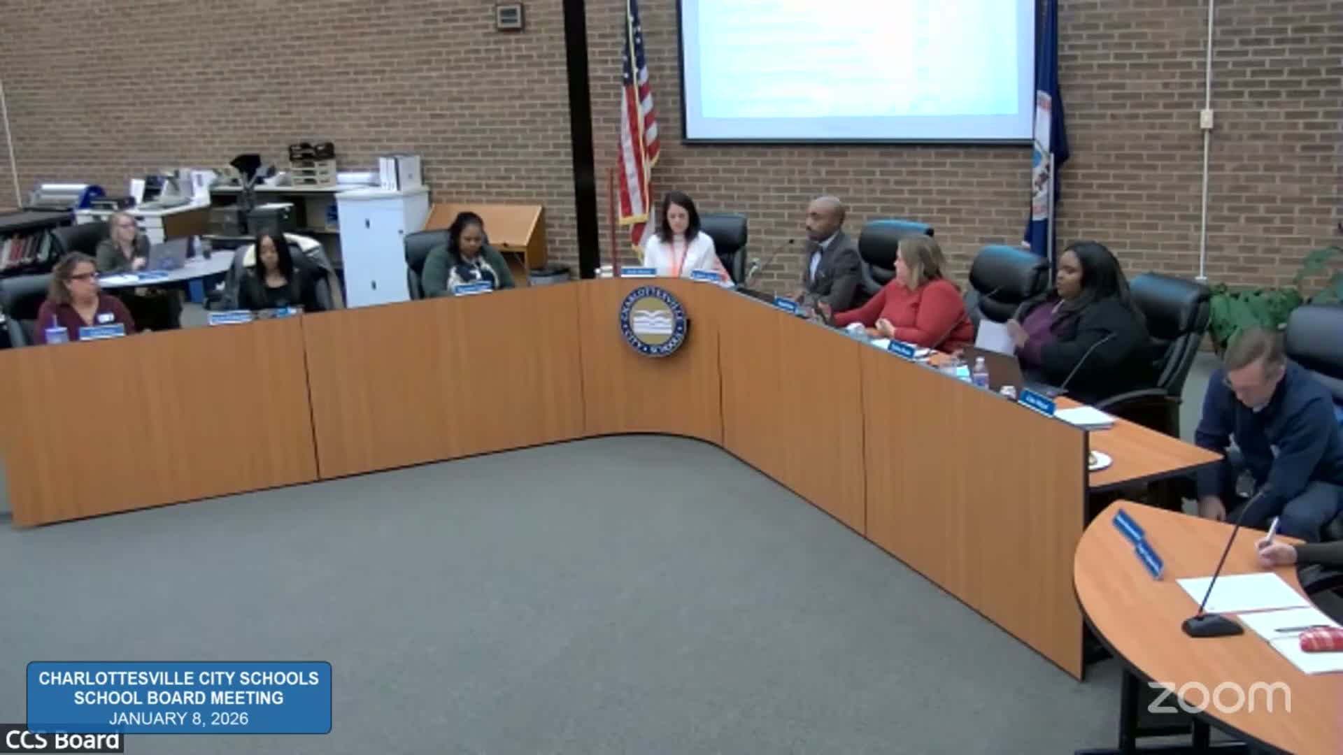 At its reorganizational meeting, the Charlottesville City Schools board elected Lisa Torres as chair and Amanda Burns as vice chair, approved clerks, and recognized school- and division-level Teachers of the Year before taking up agenda items including grants and the program of studies.