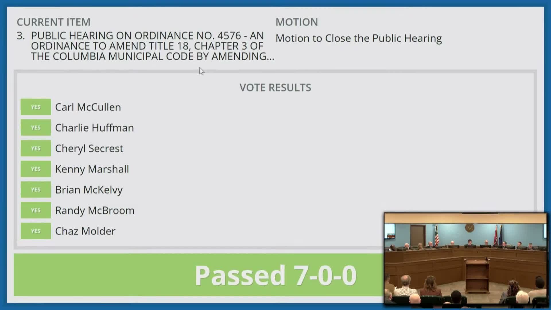The vote, on second consideration of ordinance 4577, passed 5-2 after more than three hours of public hearings and dozens of speakers who both urged immediate action and demanded pauses to explore regional alternatives. Councilmember Marshall moved the ordinance; Councilmember McCollum seconded. The roll call was: McCollum Aye, Huffman No, Seacrest Aye, Marshall Aye, McKelvey Aye, Vice Mayor McBroom Aye, Mayor Mulder No.