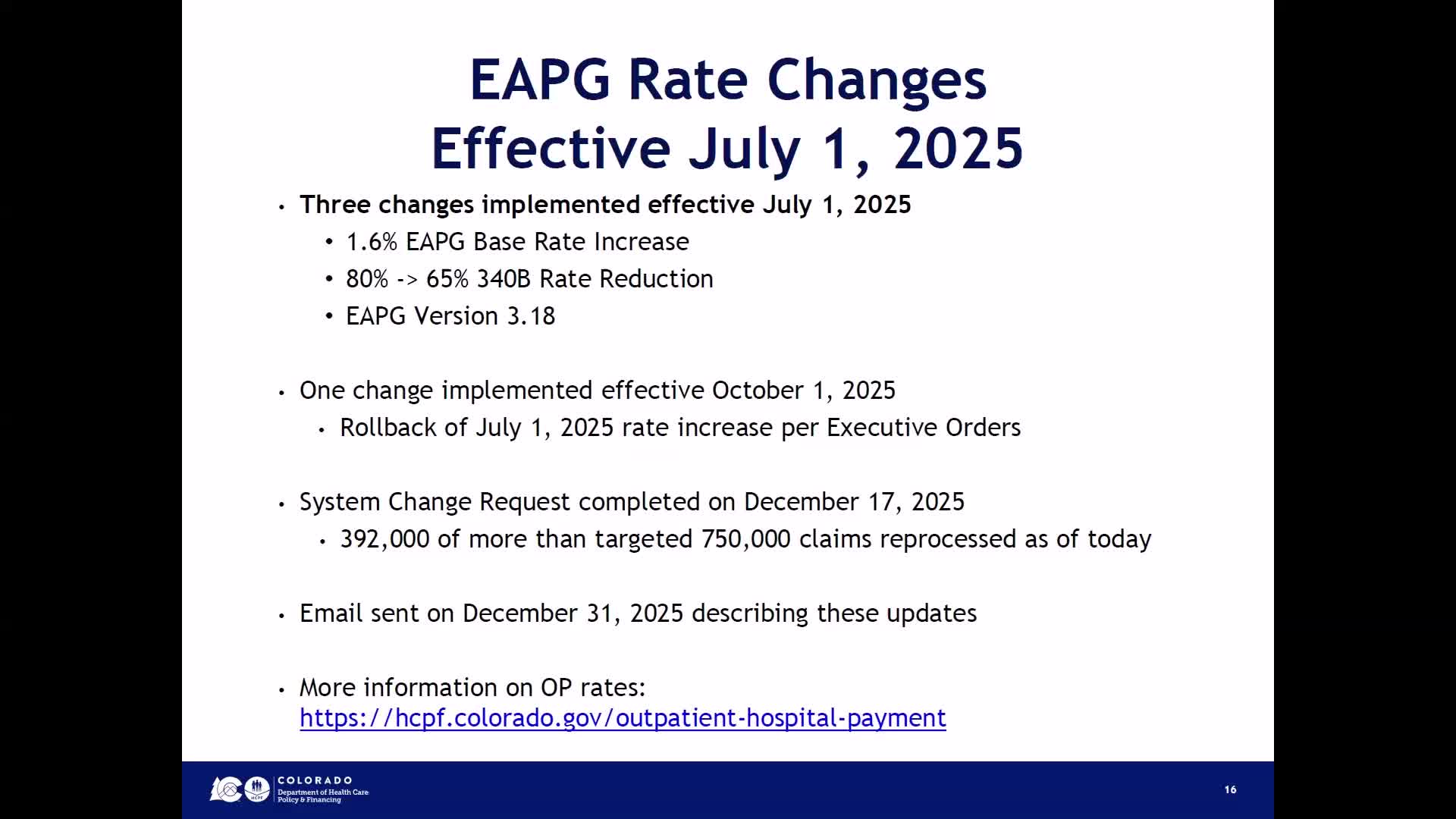 Andrew Avalos, facility rate section manager at the Colorado Department of Health Care Policy & Financing, told participants the department implemented multiple outpatient hospital rate changes last year with effective dates of July 1 and Oct. 1. He said timing constraints required waiting for EAPG version and 340B pricing updates before performing hospital-specific base-rate updates.