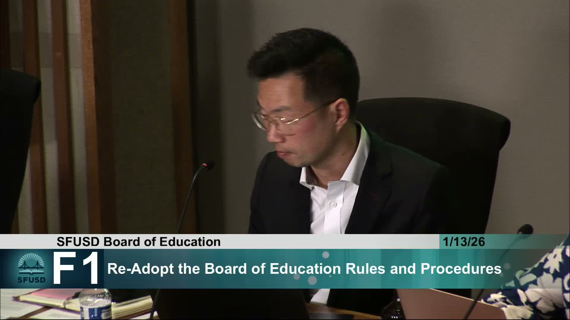 At its January 13 meeting the San Francisco Board of Education carried out routine organizational business and several consent votes. The board voted to readopt the official Board rules and procedures for 2026, recording a 7‑0 roll call vote.