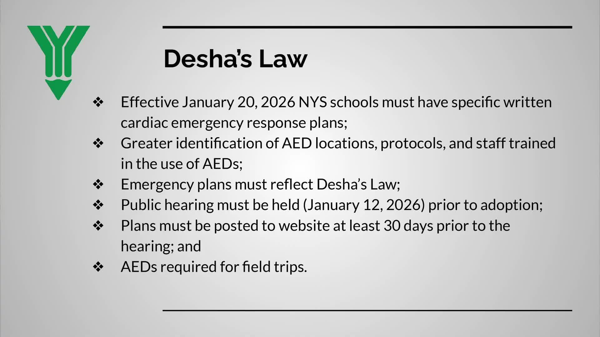 The Yorktown Central School District Board of Education adopted amendments to its districtwide safety plan to comply with Desha's Law, requiring AED access for field trips or that portable AEDs accompany students. The law takes effect Jan. 20; district officials said building‑level plans were submitted confidentially to the state.