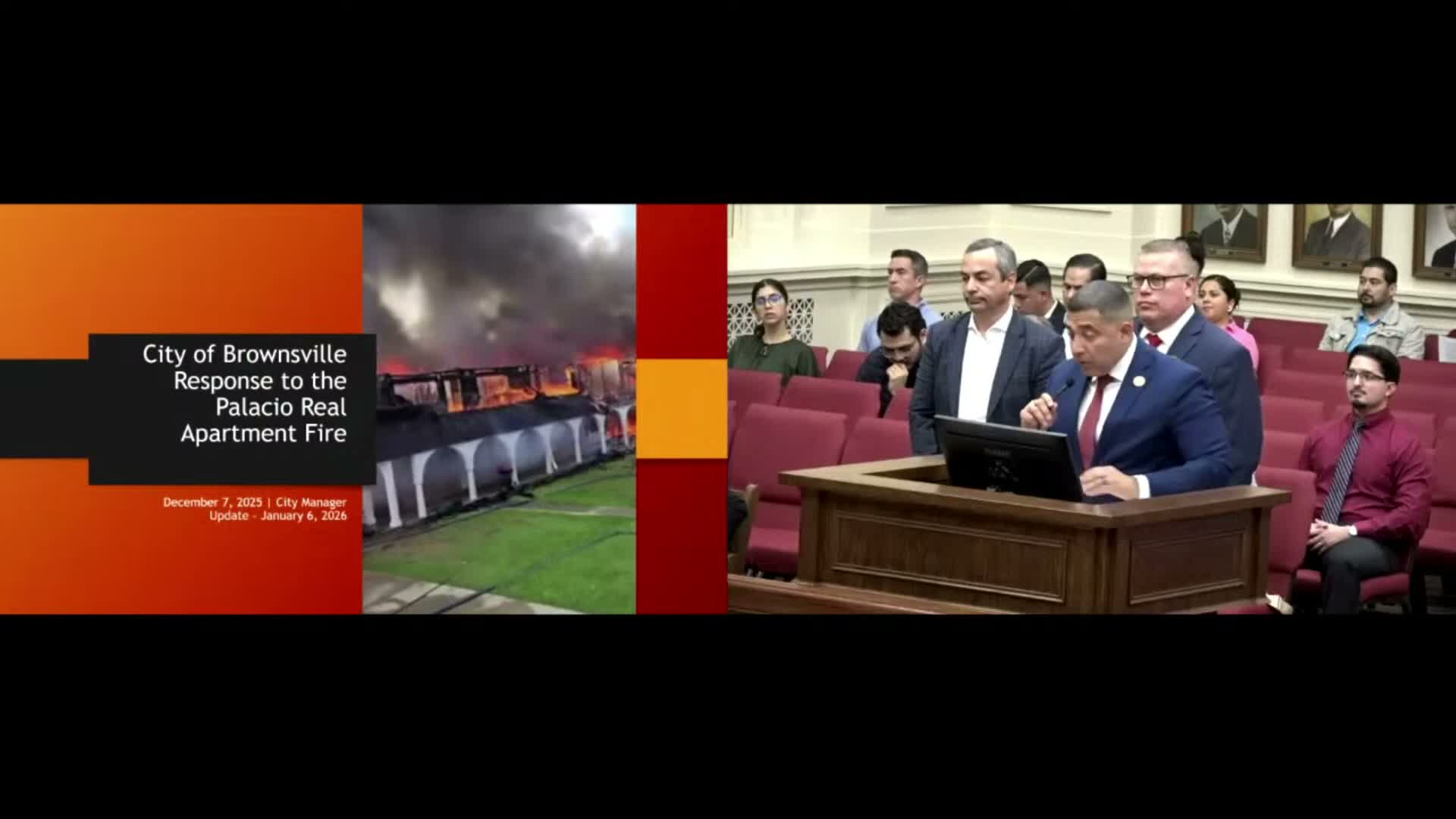 Brownsville officials on Tuesday described a multi-agency emergency response and recovery effort after a Dec. 7 fire at the Palacio Real Apartments that displaced dozens of residents.
