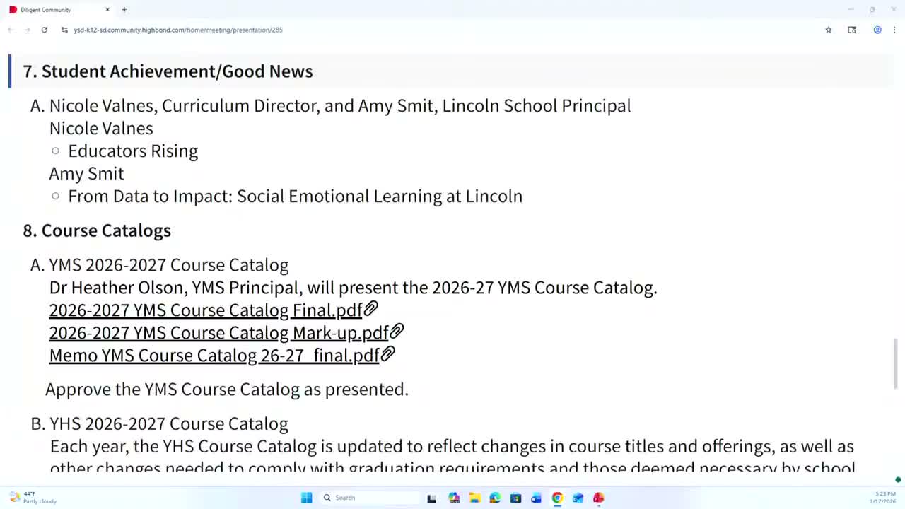 The Yankton School District 63-3 Board of Education approved the 2026–27 course catalogs for Yankton Middle School and Yankton High School after brief presentations by district staff.